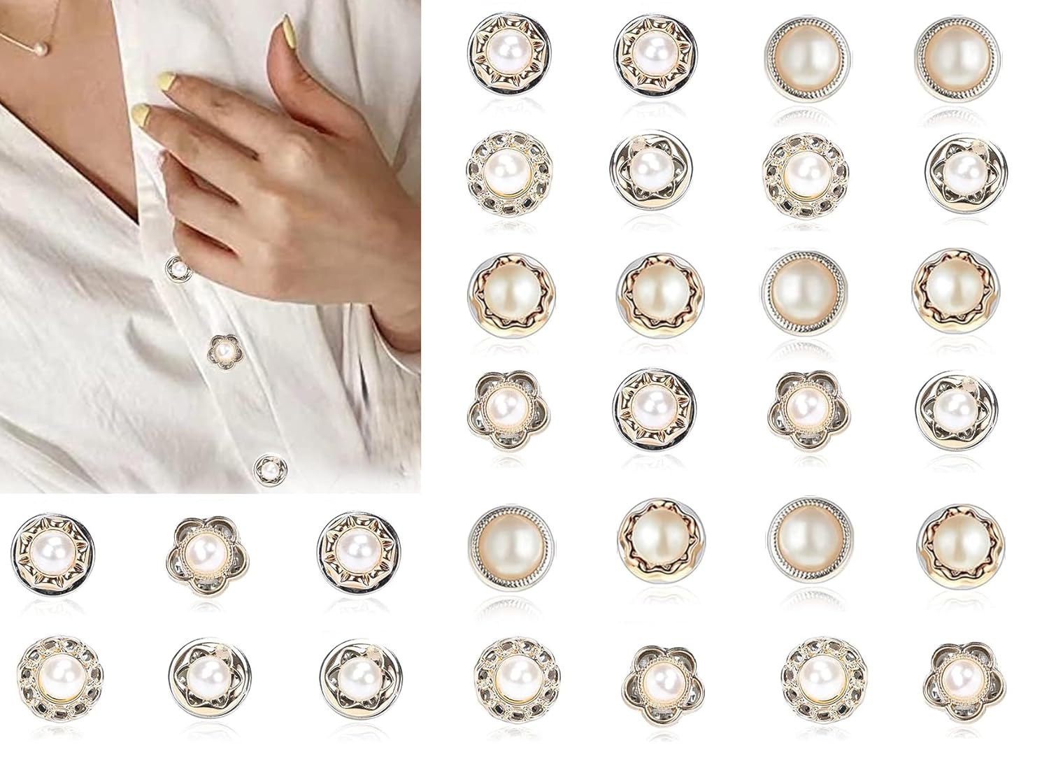 Made from faux pearl, rhinestone, plastic, and alloy. Smooth, shiny, sturdy, and safe for all fabrics—won’t fade, break, or damage your clothes.