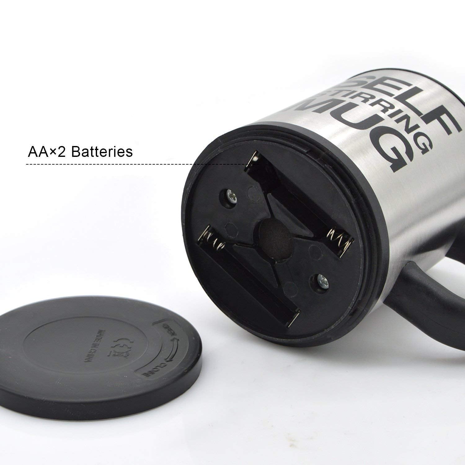 Here are the product details you need to know: Dimensions - 5.25" X 3.75" X 4.5", Capacity - holds up to 15 ounces of liquid, Battery operated - requires 2 AAA batteries (not included), Color - Stainless Steel and Black, Material - Plastic and Stainless Steel. Please note, this mug is hand wash only.